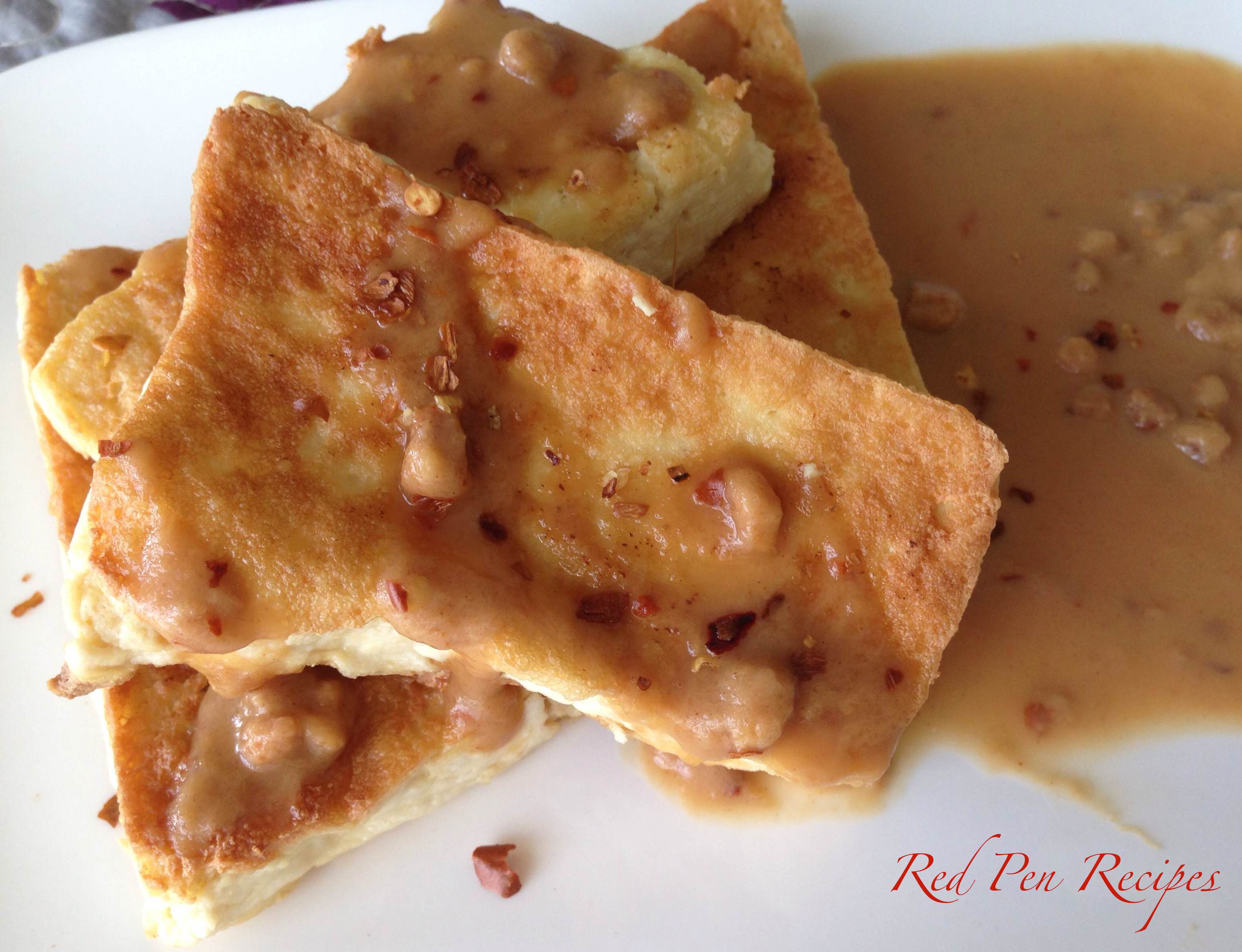Cook tofu on one side until golden brown, about 2-3 minutes, then flip and cook the other side for about another 2 minutes. Remove from heat and serve warm with peanut sauce available for dipping or toss with stir-fried vegetables and serve over brown rice with peanut sauce drizzle for a complete meal.