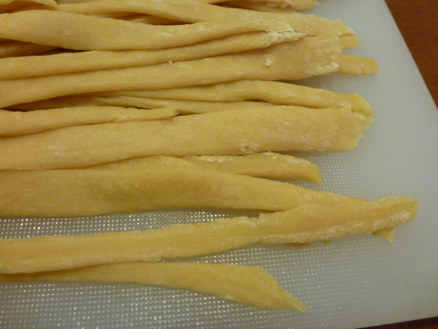 The first batch I made turned out way too thick after it was boiled. I thought I had rolled it out thin enough, but it bulked up considerably during the cooking process. It was unpleasant to eat and I ended up throwing it out. The second time around, I cut the dough into larger sections after rolling it out, rolled out each section, then cut each section into strips and rolled the strips out. It was a lot of work and the pasta still ended up slightly thicker than I wanted it to be, but this batch was much better than the first. I have a tall kitchen table, and I’m an average height, but even kneeling on one of the chairs didn’t give me enough leverage to roll the dough out as thin as it should have been.