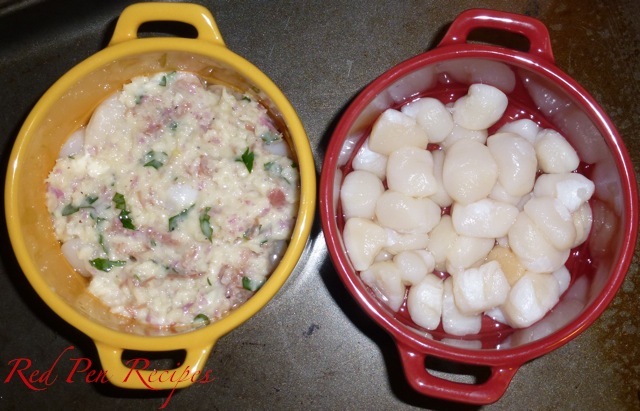 I recently purchased some bay scallops from the store. While the usual idea of just searing them and having them with a side of cous cous crossed my mind, I wanted to do something more interesting. I looked around for ideas online and came across The Barefoot Contessa’s recipe for bay scallop gratin. I had all but one ingredient — the absinthe — on hand, so I did without it. I scaled down the original recipe so it only made two servings, since I only had a half-pound of scallops.