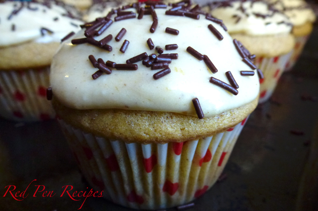 I’ve previously said that I dislike decorating baked goods, and I hold to that, but I do believe there’s a time and place for it. This was one of those instances. I came up with the frosting I wanted, but wanted to do something appropriate for the celebration. I wanted to work hearts into the decoration, so I used a box cutter to cut a heart out of a piece of parchment paper. I placed the cut-out on each cupcake and used a sieve to sprinkle powdered sugar over it. I was really pleased with the way it turned out. For the mini cupcakes, I cut a smaller heart out of a piece of parchment paper and put the larger piece of paper on each cupcake so it served as a sort of stencil. They were adorable. My friend loved them.
