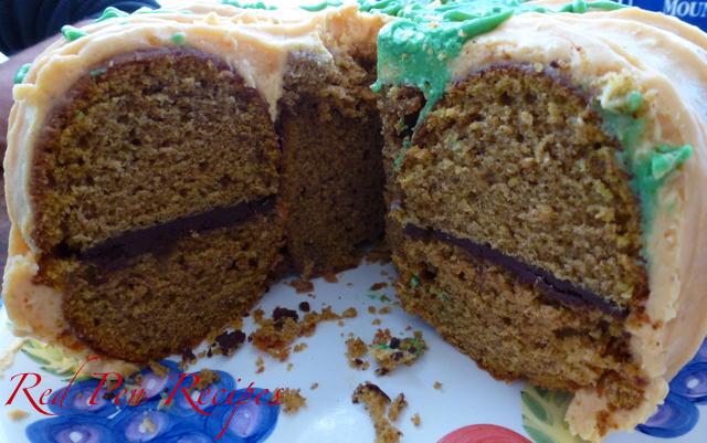 Since the cupcakes were such a hit with my staff on my sports editor’s last day on the job, I decided to also use the recipe to make my dad’s birthday cake. A while ago, I saw an idea on Pinterest for a pumpkin cake. Upon closer examination, I realized they used a pumpkin pan, but I decided to play off that creation by making two smaller bundt cakes and turning one on top of the other. It is one of the best cakes I’ve ever made — though, to give credit where it’s due, my best friend came up with the idea on how to create the pumpkin-like ridges in the frosting, and he drew the leaves. Decorating is not my thing, but it can be fun to learn a trick or two.