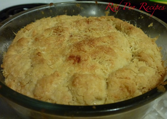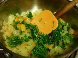 Traditional pot pies use carrots, celery and onion, but I all I had in the fridge were onions, bell peppers and broccolini. Together, the three worked well. That’s the great thing about pot pies — you can use just about anything you like to fill them. This makes one large pot pie, suitable for one hungry person.