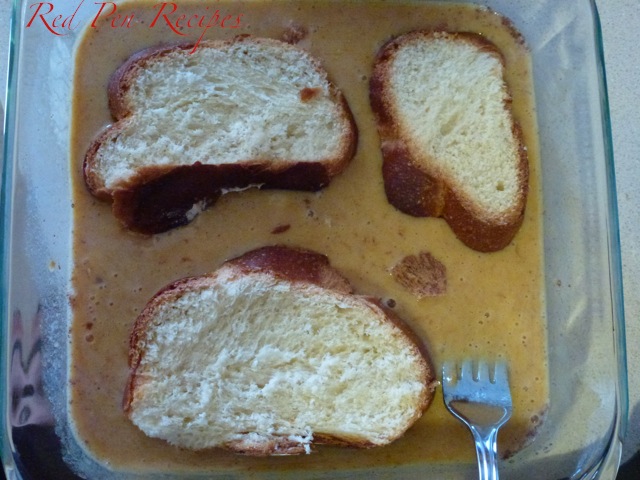 Carefully dip bread, one slice at a time, into the mixture, turning to coat. Let each slice soak for 1-2 minutes. Be careful turning the bread, as it absorbs the liquid it will start to fall apart if handled roughly.